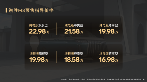 发布会现场,锐胜汽车通过“商务、家庭、营运、休旅”沉浸式场景展示,并邀请资深媒体人、企业高管及车主代表参与解读,强调车型在“企业降本增效”“家庭大空间需求”“户外休旅外放电”等场景下的适配性。同期,品牌推出预售专属权益,下订用户可享至高价值2.98万元的八项礼遇,权益有效期从2025年11月5日至12月5日。